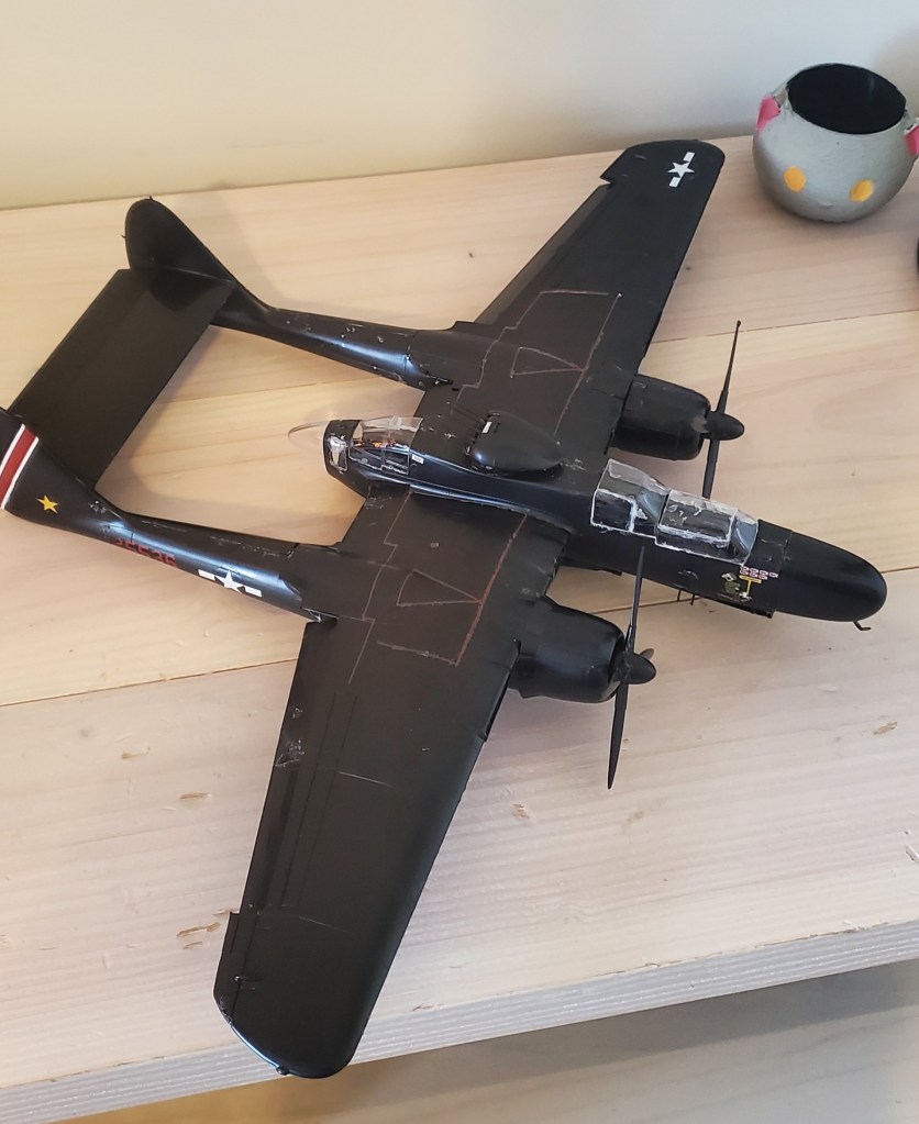 A while ago, I got a Black Widow Revel kit. There were two ways to build it. One way was for displaying it where all the hatches and windows are open and the guns and pilot seats are visible. For the second way, all the hatches and things are closed for flying. I chose the second way so that my baby brother, Frank, could play with it and not destroy the little things inside. It also came with a ton of decals. Most of them I didn’t put on because the plane is black and the words are so small you can’t see them. Although some of them were big and had brighter colors. Those are the ones you could see and they were the important ones like the plane number and USAF insignia.