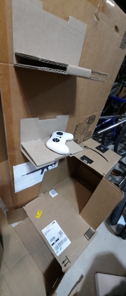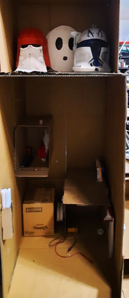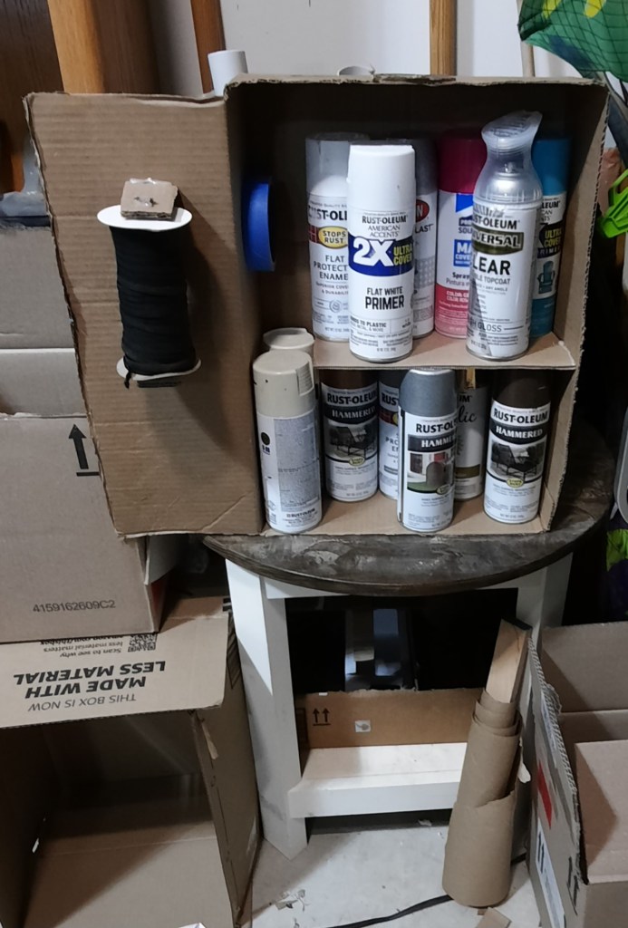 Out in the garage, where I work, has been a big mess so now I am cleaning it up and building shelves and drawers. I’ve put up a big cabinet for my tools and a shelf for my spray paint and elastic bands.