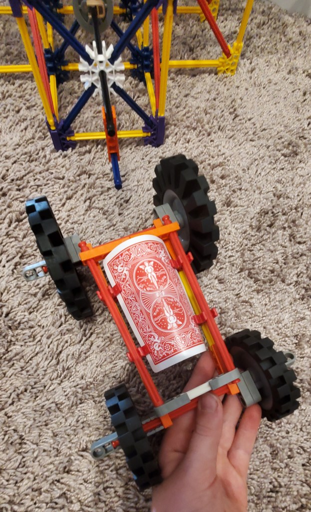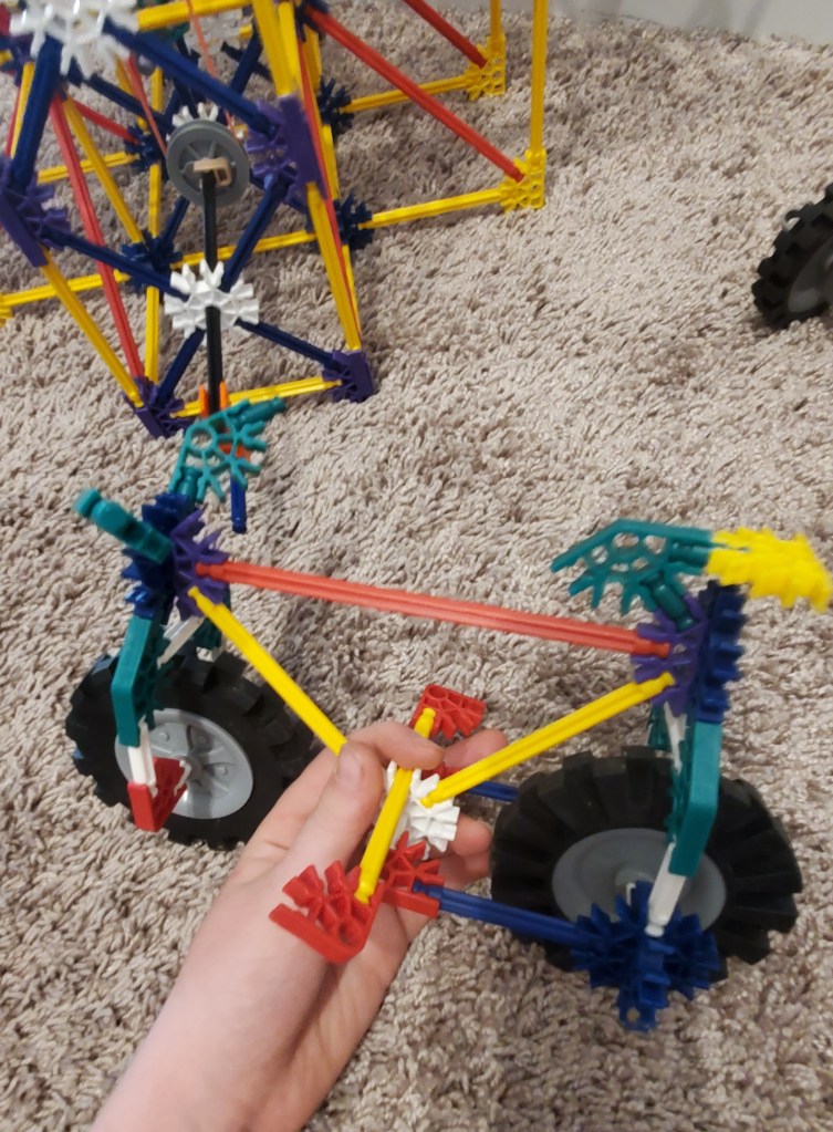 Yesterday, we got a tool box full of Kinex. It came from our Dad’s mom who has a whole bunch of toys.