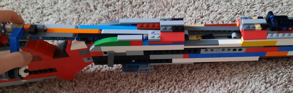 It has features like a working bolt, working clip, and an adjustable iron sight. Instead of shooting rubber bands it shoots Technic bricks.