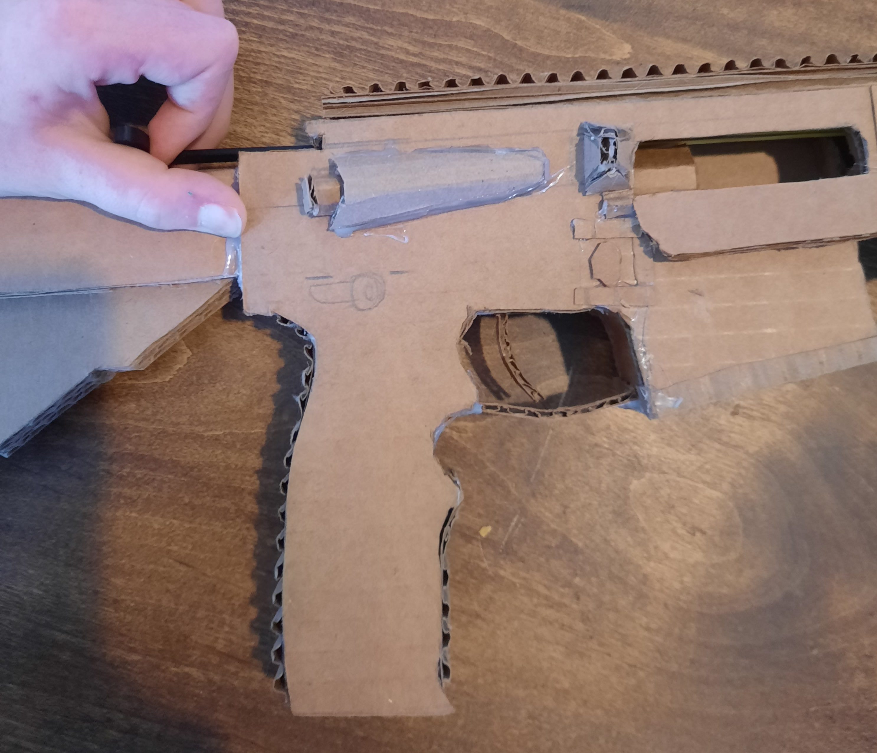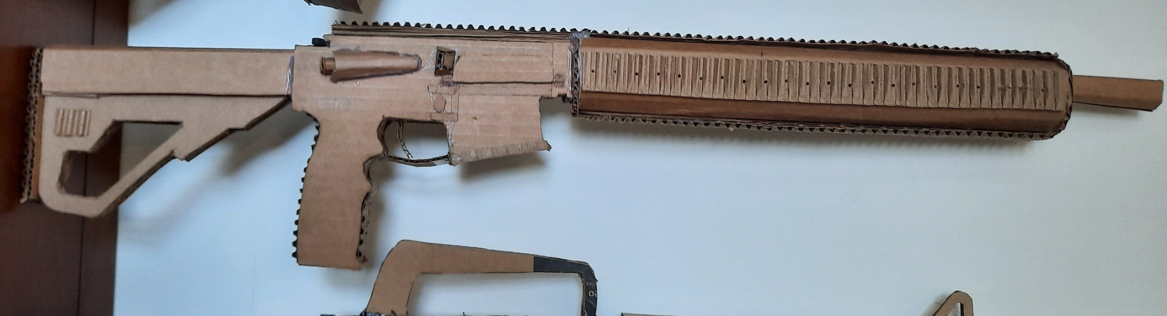 Thursday, I finished building one of my detailed cardboard guns. It is modeled after the AR-15. AR-15 stands for ArmaLite Rifle, which is the name of the company that originally developed the rifle platform.